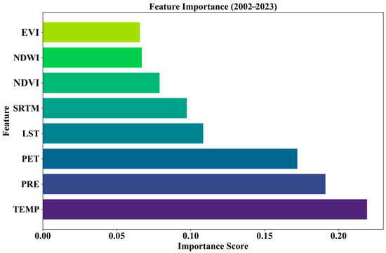 The feature importance analysis (Figure 3) revealed the relative contribution of each environmental variable to the GRACE groundwater storage downscaling model. TEMP emerged as the dominant predictor with 21.93% importance, followed closely by PRE at 19.12% and PET at 17.21%. LST and SRTM contributed moderately at 10.85% and 9.74%, respectively. NDVI, NDWI, and EVI showed comparatively lower importance values ranging from 6.57% to 7.90%. This distribution suggested that meteorological factors, particularly temperature and precipitation, played more significant roles in controlling groundwater storage variations in the Hexi Corridor than vegetation-related factors. The prominent influence of temperature aligned with the arid characteristics of the study area, where high temperatures drove evaporation processes and significantly impacted water balance dynamics.
