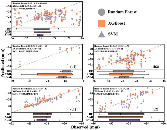 Upon integration of clustering methodologies, the predictive capabilities of all algorithms improved markedly. Specifically, the hierarchical clustering approach significantly enhanced downscaling accuracy in (b1). The RF algorithm’s correlation coefficient increased to 0.96. Similarly, the SVM and XGBoost algorithms showed improved performance with correlation coefficients of 0.83 and 0.68, respectively. In (b2), the RF algorithm maintained superior performance, with a correlation coefficient of 0.62, followed by XGBoost with a correlation coefficient of 0.51 and SVM with a correlation coefficient of 0.48. After implementing K-means clustering, the performance differentiation of each algorithm across distinct regions became more pronounced. In (c1), the correlation coefficients of the RF and XGBoost algorithms reached 0.86 and 0.83, respectively. In (c2), all three algorithms exhibited enhanced predictive performance, with correlation coefficients for RF, SVM, and XGBoost reaching 0.87, 0.87, and 0.74, respectively.