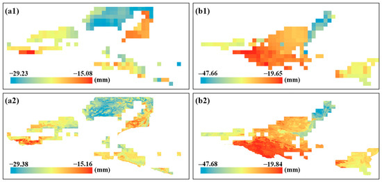 Spatial distribution patterns of GRACE groundwater storage in January 2019: (a1,b1) show original groundwater storage at 0.25° resolution before downscaling in regions (a) and (b), respectively; (a2,b2) show downscaled groundwater storage at 1 km resolution in the corresponding regions.