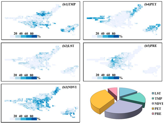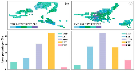 Figure 9 and Figure 10 illustrate the relative contributions of multiple driving factors, LST, TMP, NDVI, PET, and PRE, to GRACE groundwater storage variations across the two identified cluster regions, explicitly delineating the spatial heterogeneity characteristics of the study domain.