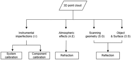 TLS measurements, similar to any other measured geodetic observations, are generally impacted by three main error sources—gross errors (blunders or outliers), random errors, and systematic errors. In short, systematic errors are those that can be mathematically modeled, and for TLSs, these are categorized into four geometries covering the scanner (instrument construction), laser (signal and atmosphere), scanning (measurement), and targets (noise) (Figure 4):