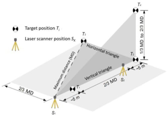 The targets were scanned four times from each station within the proposed distances (maximum distances (MD)) (Figure 7). Afterward, the distances and their differences in addition to the measurement uncertainty were determined from the selection of target coordinates. Then, the ultimate precision of the instrument could simply be computed using straightforward computational practices [84,90,91].