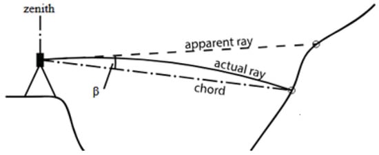 Figure 8 graphically represents the geodetic refraction of the line of sight between the instrument and the scanned scene (i.e., the straight line (real ray or chord) is the corrected path of measurement, and its deviation to the actual ray creates a deviation in range and potentially angle measurements.