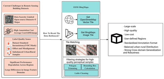 Although high-resolution satellite imagery is increasingly accessible, publicly available datasets specifically curated for building detection remain scarce and fragmented. Many suffer from limited geographic coverage, inadequate scene diversity, or modest sample sizes. Manual footprint annotation is also slow, costly, and error-prone, posing serious obstacles to scalable, repeatable deep learning workflows [18]. Consequently, automated, scalable, and accurate dataset-generation strategies have become a priority in remote sensing research. Leveraging open geospatial resources such as OpenStreetMap (OSM) and pairing them with high-resolution imagery plus quality-aware filtering offers a promising route to alleviate the annotation bottleneck. We therefore propose an automatic semantic labeling framework that aligns OSM vector data with Bing Maps imagery, filters low-quality samples, and automatically produces precise building annotations. The major limitations in current building datasets and the proposed solution strategy are summarized in Figure 1.