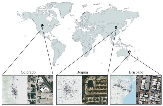 This study selected urban and suburban areas in Colorado, Beijing, and Brisbane as public test regions to evaluate the generalization performance of detection models across diverse geographic environments. A high-quality test dataset comprising 1267 samples was manually annotated and carefully validated to ensure high precision and consistency in building boundary delineation. The dataset captures a wide variety of architectural styles across different countries and urban settings, and exhibits strong representativeness in terms of sample distribution, image quality, and scene complexity. It serves as a reliable benchmark for assessing model stability and robustness in real-world cross-regional applications. The example diagram is shown in Figure 2.