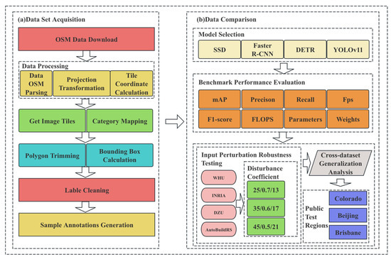 To construct a high-quality dataset for building detection research, we developed a systematic pipeline that integrates OpenStreetMap (Version SVN R11427) vector annotations with high-resolution Bing Maps (API version 13) imagery. This section outlines the methodology employed in this study, including the dataset construction process, model selection, and evaluation metrics. Figure 3 presents the overall framework of the study. This study adopts zoom level 19 tiles as Bing Maps at this level provides a ground sampling distance (GSD) of approximately 0.3 m per pixel. In urban areas, typical building footprints range from 25 to several hundred square meters. At this resolution, even small residential buildings can occupy between 50 and 300 pixels in an image, which is conducive to the extraction of meaningful spatial and structural features by convolutional neural networks. In contrast, zoom level 18 corresponds to a lower spatial resolution of approximately 0.6 m per pixel, where small buildings cover significantly fewer pixels, making them more likely to be missed by detection models and thereby reducing overall detection accuracy. Moreover, OpenStreetMap (OSM) provides vector-level building footprint annotations with spatial precision that often exceeds that of the imagery itself. The use of zoom level 19 facilitates more accurate alignment between OSM annotations and Bing Maps imagery due to the higher visual resolution, effectively reducing spatial misalignment errors. This helps to minimize annotation noise at the source and enhances the overall quality of the training dataset. The dataset generation workflow consists of the following four main stages: (1) parsing OSM data and retrieving corresponding tile images; (2) automatically generating initial bounding box annotations; (3) filtering and refining the annotations; (4) aligning the final annotations and exporting them in a standardized format. The entire pipeline is automated using custom Python (Version 3.9.21) scripts. The resulting dataset serves as the training and evaluation source for the following four representative object detection models: SSD, Faster R-CNN, DETR, and YOLOv11s. The complete workflow is illustrated in Figure 4.