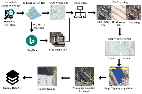 This study proposes an automatic building sample generation algorithm. The algorithm parses OSM vector tile data, performs projection conversion and tile coordinate calculation, and then conducts accurate indexing and downloading of Bing Maps image tiles. Subsequently, it implements category mapping and geometric processing, utilizing the Polygon Trimming Algorithm to dynamically calculate the area of cut sub-regions for determining target retention or discarding. Finally, Label Cleaning is performed to eliminate redundant interference caused by tiny building boxes or mislabeled targets, generating annotation files in VOC format and corresponding images.