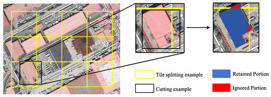 When a building or any target object is divided across multiple image tiles, its annotation boxes may be fragmented into several partial segments. Including these small fragments in training is undesirable as they often correspond to ambiguous regions such as eaves, shadows, or unidentifiable object remnants. However, discarding too many of these fragments may result in the complete loss of valid targets. To address this issue, this study introduces the Adaptive Contribution-based Retention (ACR) algorithm, a rule-based mechanism designed to automatically retain meaningful object segments while filtering out uninformative ones [32,33,34]. The core decision formula of ACR is defined as follows: