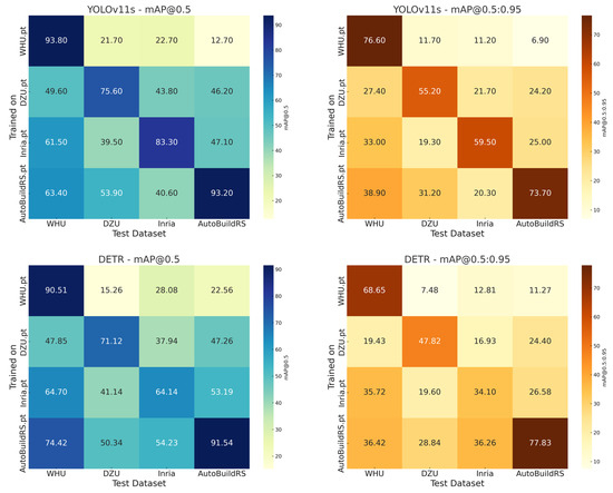 Figure 9 shows that in all cross-domain evaluations, models trained on AutoBuildRS delivered the most stable out-of-domain performance, whereas those trained on WHU and DZU deteriorated sharply when tested on external datasets. For instance, a WHU-trained YOLOv11s model dropped to 21.7 mAP on DZU, and its DETR counterpart fell to 15.3 mAP, highlighting a pronounced distribution shift. Models trained on INRIA showed intermediate transferability—high accuracy on their native split but inconsistent results on DZU and AutoBuildRS. These results demonstrate that AutoBuildRS, owing to its greater scene diversity and annotation consistency, provides markedly superior cross-domain robustness.