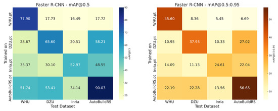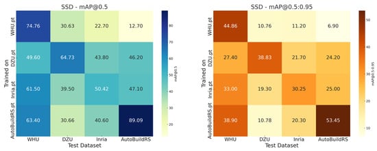 From Figure 10, we can conclude that AutoBuildRS.pt demonstrates the highest cross-domain robustness in both the Faster R-CNN and SSD frameworks. Within Faster R-CNN, AutoBuildRS.pt attains a mAP of 90.03 on its native test set and preserves competitive accuracy on the external WHU, DZU, and INRIA datasets. A similar trend is observed under SSD, where AutoBuildRS.pt again delivers the highest accuracy on the AutoBuildRS test set. By contrast, WHU.pt and DZU.pt perform consistently worse on non-native datasets, with their mAP on AutoBuildRS falling below 20 in nearly all cases.