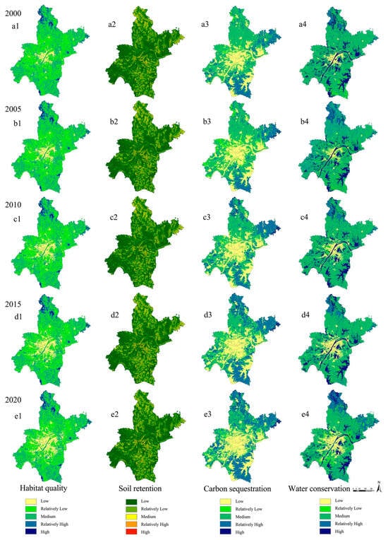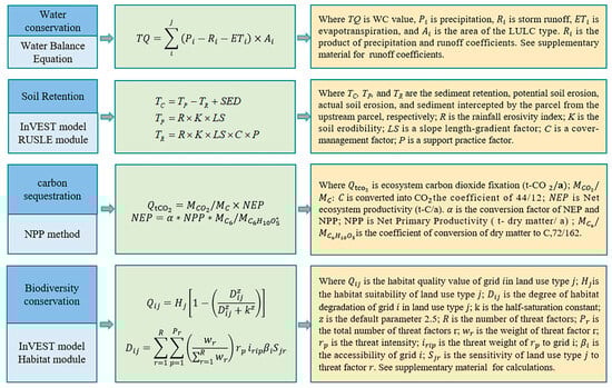 - According to ecosystem service theory, ecological functions include regulatory, supporting, and provisioning services [46]. In this study, four typical ecosystem services—habitat quality (HQ), water conservation (WC), soil retention (SR), and carbon sequestration (CS)—are selected to represent functional outcomes, reflecting the service capacity of ecological patches. HQ indicates habitat stability and integrity, WC reflects hydrological regulation capacity, which is especially important in lake-dense urban areas [47], and SR and CS capture soil and carbon regulation capacities in response to environmental pressure [48].