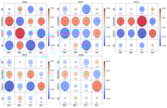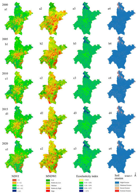 - According to the LEH framework, process evaluation should capture system vigor, resilience, and sensitivity [34]. Accordingly, process indicators include NDVI (plant vigor), modified normalized difference water index (MNDWI, water dynamics), an eco-elasticity index (comprising resistance, adaptation, and recovery), and ecological sensitivity (represented by soil erosion). These indicators capture the spatiotemporal dynamics and adaptive capacity of the urban ecological system under disturbance. MNDWI is chosen to emphasize the urban hydrological dynamics relevant to Wuhan’s landscape, especially for distinguishing surface water changes where NDVI is limited [49]. The resilience and sensitivity indices reflect the system’s response thresholds and recovery capabilities [50].