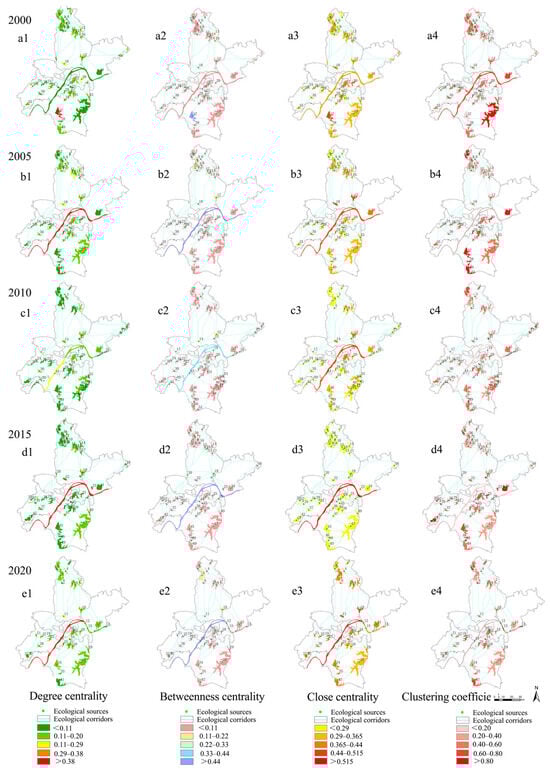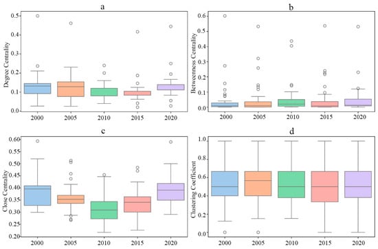 - From the pattern dimension, based on complex network theory, EN structure is described through four topological indicators: degree centrality, betweenness centrality, closeness centrality, and clustering coefficient. These reflect connectivity, nodal importance, accessibility, and local structural aggregation [33,51], allowing quantitative assessment of network configuration.