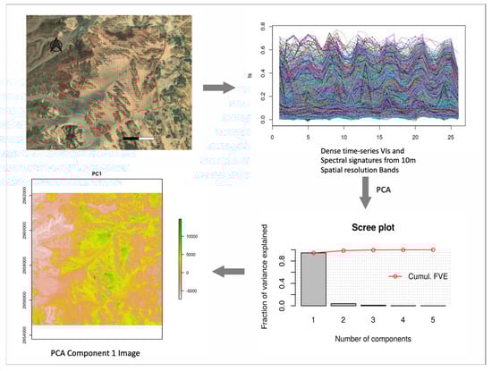 In addition to spatial information from VIs, we explored information lurking in the spectral signatures (for both vegetation and non-vegetation) to potentially improve the classification based on VIs. For each of the computed VIs, we extracted the corresponding spectral bands to create a raster stack of spectral signatures. A total of 20 spectral bands (4 from each VI corresponding to the blue, green, red, and near-infrared bands) were subjected to a Principal Component Analysis (PCA) data reduction procedure to obtain a set of uncorrelated spatial features. Based on the PCA, 5 principal components (PCs) explained about 99% of the variance in the spectral signatures for the study area (Table 2), of which 4 were most significant [52]. The PC (raster layers) estimation procedure is illustrated in Figure 2. The PC raster layers served as additional explanatory variables for vegetation and land cover classification. Thus, in total, we used 10 raster layers (5 PCs and 5 VIs) as the spatial predictors or environmental space for vegetation classification.
