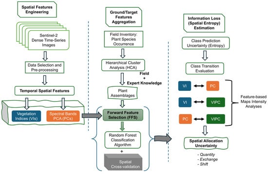 The image classification, uncertainty analysis, and intensity analyses were conducted within the R Studio (version 2023.06.0+421) environment using several available libraries of the R programming language [62,63,64]. The overall analysis design and procedure of data collection, image processing and classification, and assessment of class spatial allocation entropy are graphically illustrated in Figure 4.