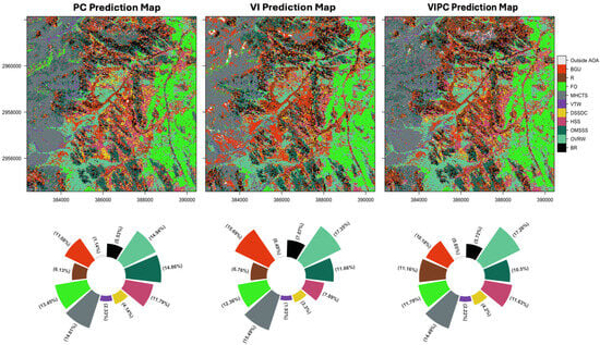 To resolve the contribution of vegetation indices versus spectral signature (principal) components in class predictions, intensity analysis was applied to assess the spatial configuration of vegetation classes or land cover [58,59]. This enabled quantifying the class change and dynamics between the classification models and the underlying change patterns and intensity related to the spatial predictors. The marginal difference in overall accuracies between the classification models supports direct comparison of class prediction and spatial allocation in the respective thematic maps (Figure 5). The change pattern in the predicted class supports our understanding of the contribution of the different predictor features, or their interaction, to pixel classes at different spatial scales.