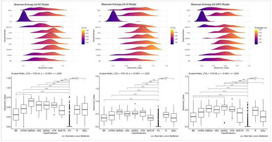 To ascertain the level of information or uncertainty in class predictions, the Shannon entropy was employed as a measure of the reliability in the predicted probabilities (class votes) by the random forest ensemble models. The estimated Shannon entropy (uncertainty) was compared between classes and across the different models (predictor features). To evaluate the within-class variability in uncertainty, we applied the Kernel density (distribution) profiles and the non-parametric Kruskal–Wallis test with mean comparison based on the Dunn test pairwise comparison and the Bonferroni p-value adjustment.