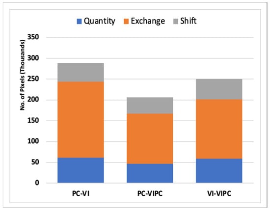 Overall differences in class quantity and allocation (exchange and shift) between the classification models (maps) are presented in Figure 7. The exchange component represents the allocation difference due to pairwise confusions, while the shift component estimates the allocation difference from non-pairwise confusions. The class allocation components, exchange, and shift accounted for most of the difference between all three thematic maps. The highest class disagreement was observed between the thematic maps from the spectral components (PCs) and vegetation indices (VIs); compared to the latter, the former had a lower allocation difference to map predictions based on combined predictors (VIPCs). Although the overall accuracy of the VI-based map was higher than that based on the PC predictors, the latter showed more consistency in discriminating other vegetation assemblages except for farms and orchards. With reference to the combined (VIPC) model, the overall quantity disagreement in the PC-based classification (7.60%) was less than that observed in the VI-based classification (9.68%). For the PC to VI map transition, the quantity component derives largely from a net gain of two non-vegetation categories—R and BR, and the net loss in two vegetation categories—OVRW and OMSSS (Figure 8). The contribution of such classes to the quantity component is backed by the heterogeneous nature and distribution of vegetation in the desert landscapes as modulated by major landforms and topography. Such spatial heterogeneity in vegetation and landforms is well captured in class entropy (uncertainty) distribution across the different classification models (Figure 6). Thus, in comparing transitions between thematic maps, class entropy distribution provides insights into class predictability and the magnitude of contribution to pairwise (exchange) and non-pairwise (shift) confusions.