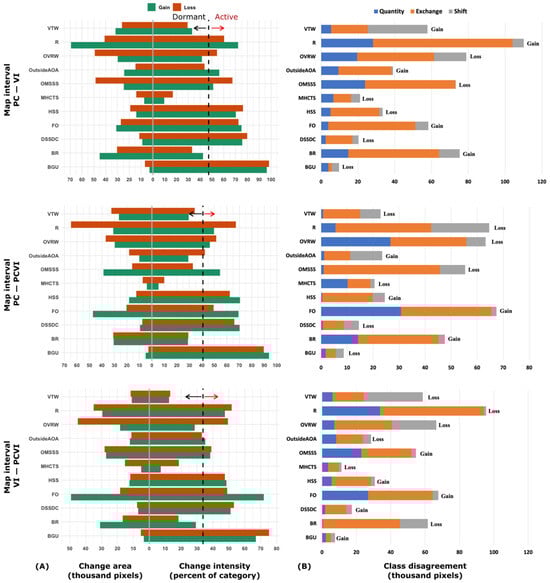 Land cover/use category-level change intensity and class disagreement for the three predicted maps: (A) Graphs on the left show the change in intensity. The mapped categories are indicated as a pair of bars for the loss and gain between the map intervals. Bars that extend to the left of the 0 axis are the sizes (no. of pixels) of the loss or gain, and those that extend to the right are the intensities (proportions) of loss Lti or gain Gtj—each the size of the corresponding bar to the left of the 0 line divided by the category’s total size. For each map interval, the black dashed line represents the value of uniform spatial intensity St. If a bar extends above the uniform intensity line, the change in intensity for the category is active. If a bar stops below the uniform intensity line, then the category is dormant. (B) Graphs show the three different class disagreements for the transition-level change intensity between each reference and comparison map. Labels for each category indicate the overall quantity difference between maps (the gain is the sum of pixels at the reference or final map minus the persistence, while the loss is the sum at the comparison or initial map minus the persistence).