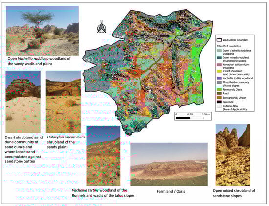 In remote sensing of vegetation, the use of vegetation indices (VIs) has been largely successful in mapping high and dense vegetation [19,22]. Such vegetation retains leaf and related phenological cycles over prolonged periods, which feeds the sensitivity of VIs and other proxies as feature texture. Leaf phenology and texture are captured in aerial or satellite images and across time series to inform the differentiation and mapping of different and mixed vegetation [15,21,22,23,24]. However, such proxies of vegetation may be applicable and reliable in arid and desert landscapes to a lesser extent. In arid and desert landscapes, permanent vegetation prevails in cultivated farms and active oases, in existent montane forests, and sparse woodlands. A considerable proportion of the vegetation has ephemeral distribution, with very brief periods of green leaf phenology—chlorophyll retention—during periods of rainfall and water flushes into the Wadis (water channels and catchments). Since these periods of vegetation proliferation are often erratic and short-lived, field observations of vegetation occurrence and distribution may not be readily reflected in remote sensing-based proxies of vegetation status. And these proxies may be less sensitive, or lack sensitivity entirely, in relation to observed non-green, dried, and sparse vegetation [25,26,27]. Usage of spectral-based VIs as spatial predictors to map and monitor arid vegetation is increasingly questionable [11,26,28] and may be unreliable for different and specific landscapes [11,20,25,27,29,30,31]. Thus, for ephemeral and mostly dry vegetation in arid landscapes, it is unreasonable to continuously apply or assume unverified reliance on vegetation index (VI) proxy from multi-spectral remote sensing data. Such a proxy may be reliable under certain landscape specifics—such as in areas with persistent vegetation cover—and in other circumstances may provide only complementary information in discriminating vegetation assemblages and mapping their distribution.