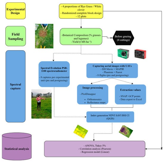 There are some studies with remote sensors in which the spectral response of the pasture is analyzed with respect to its botanical composition, such as [], in which a pasture quality index (PQI) is calculated by the principal component analysis (PCA) method and one of the variables considered is the composition of the pasture, and [], in which after estimating the quality and quantity of the pasture with hyperspectral cameras and machine learning, the author recommends extending the study to legume-grass configurations. The importance of RS techniques for yield prediction has been scientifically evidenced [,], and UAV sensors are increasingly used for this purpose [,,,,,].