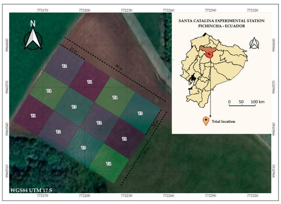 This research was performed in lot 31 of the National Livestock and Pasture Program of the Santa Catalina Experimental Station (E.E.S.C) in the Province of Pichincha, central Ecuador (Figure 2). This site is located at an altitude of 3058 m above sea level within the Inter-Andean Valley, surrounded by a variety of volcanoes [,]. The climatic zone is characterized by being humid–temperate, with a relative humidity of 79%, an average annual temperature of 12 °C and an average annual precipitation of 1300 mm []. Our research approach was as follows.