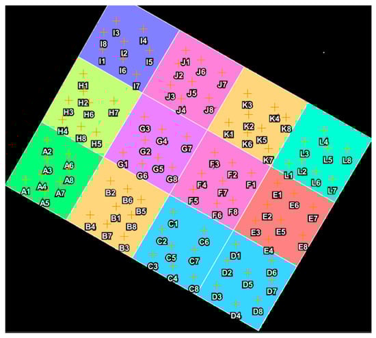 The experiment was set up as a randomized complete block design, controlling for spatial variability and ensuring statistical robustness, with 12 square experimental units of 400 m2 each in a net area of 4800 m2. The treatments in these tests are shown in Table 1 and Figure 3.