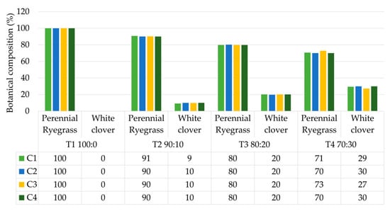 Furthermore, the contribution of each species was analyzed to verify that the yields coincided with the proportions initially sown (Table 7). In all treatments, perennial ryegrass contributed more than 50% of the yield, rising to 58% of the total yield with 5.70 and 4.84 t DM ha−1 during cuttings 1 and 2 (winter) and contributing 52% with 4.13 and 3.45 DM ha−1 in cuttings 3 and 4 (summer). The 100:0 association, with 5.23 t DM ha−1, was the one that presented the highest perennial ryegrass yield, while the 70:30 association, with 3.86 t DM ha−1, had the lowest yield.