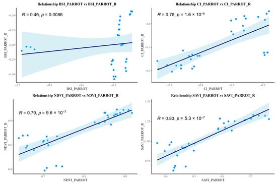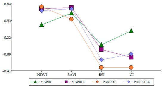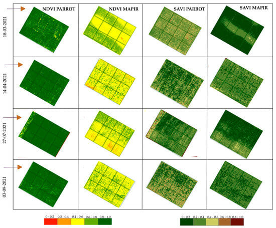 For the calculation of the NDVI, BSI, CI, SAVI and AVI, the same Excel 2019 software was used, and the equations described were used with the average values of the minimum and maximum ranges of the pseudo-bands generated by the Parrot Sequoia multispectral sensor (senseFly Inc., Cheseaux-sur-Lausanne, Switzerland) and the Survey 3W-Red+Green+NIR spectral sensor (Peau Productions, Inc., San Diego, CA, USA) (Table 2).