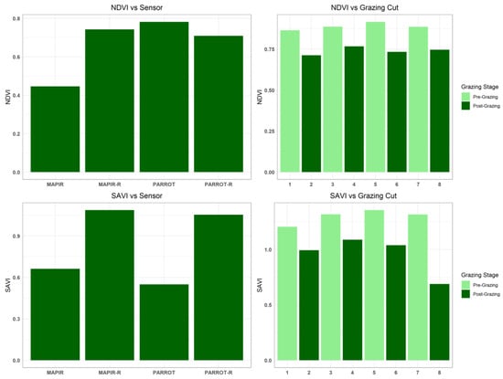 A total of eight flights were performed before and after grazing with the DJI Mavic Pro UAV with a Survey 3W-Red+Green+NIR camera and the DJI Phantom 4 UAV with the Parrot Sequoia multispectral camera (G+R+RE+NIR). The purpose was to generate vegetation indices and analyze their differences statistically (Table 3). This selection allowed for a comparison of plant vigor and ground cover performance, which is key to selecting appropriate monitoring technologies in pastoral systems.