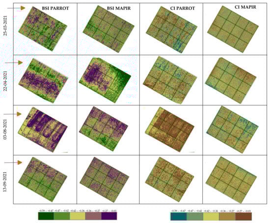 From the capture of spectral data with a spectroradiometer and the flights performed with the UAVs and multispectral cameras in the test, results for the NDVI, SAVI, BSI and CI based on the reflectance values were obtained. Each of them was analyzed according to the proportion, sensor and cut, and comparative graphs of these analyses were generated to identify a relationship between them. To interpret the NDVI and SAVI vegetation indices, values between 0 and +1 need to be presented, with higher values or values closer to 1 indicating greater vigor of the vegetation. Each criterion was defined with an index value of 1 to check if the index characterized the vegetation, especially the pasture forage. The spatial distribution of the vegetation indices is illustrated in Figure 5.