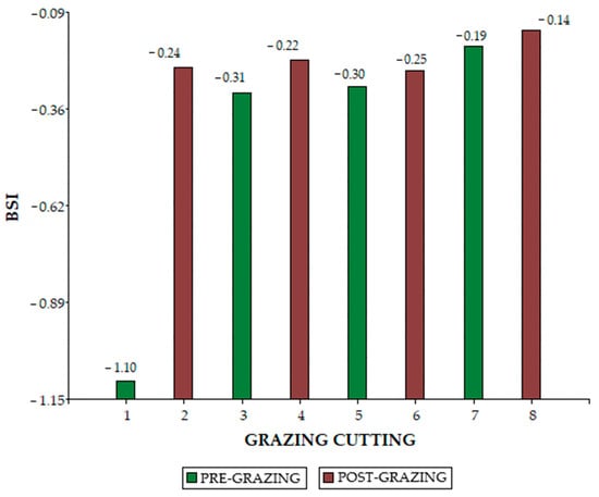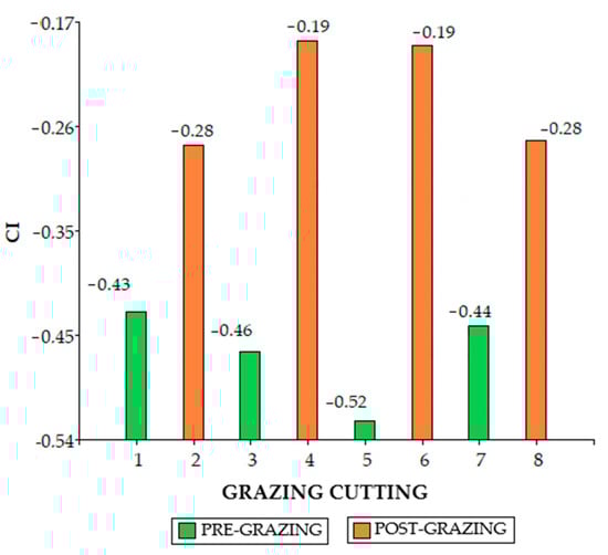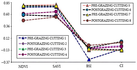 As illustrated in Figure 6, according to the analysis for each cut, different behavior of the NDVI is observed during the grazing of the forage mixtures, where the NDVI reaches its best enhancement according to the complete phenological development of grass in cuts 1, 3, 5 and 7. These correspond to pre-grazing, with NDVI values of 0.75, 0.77, 0.79 and 0.78, respectively, and for cuts 2, 4, 6 and 8, which are after grazing, the NDVI presents values of 0.59, 0.62, 0.59 and 0.48.