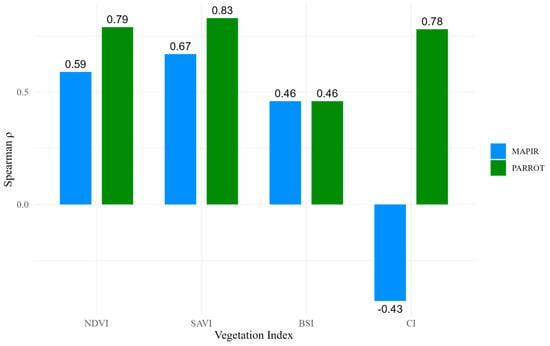 For the generation of vegetation and soil indices, Equations (1)–(3) were used, which were performed in the QGIS 3.42.0 software using the Raster Calculator tool. For the Parrot Sequoia camera, the reflectance images generated for the green, red, red-edge and NIR bands were used, and for the Mapir sensor, the calibrated orthomosaic was used, which included the red, green and NIR bands. The indexes obtained were finally exported as an image file in .tif format, compatible with any GIS platform.
