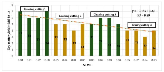 The yield was evaluated in each net plot in four cuts before each grazing period using a 0.25 m2 (0.50 m × 0.50 m) metal quadrant to record the average weight of yield and estimate it in t of dry matter (DM) ha−1 at each sampling point []. To evaluate the dry matter, the fresh grass sample, which had been placed in a sealed paper bag to prevent moisture loss, was weighed. It was then dried in a forced-air oven at 55 °C for 48 h until constant weight. To estimate the dry matter yield, the following equation was used [].