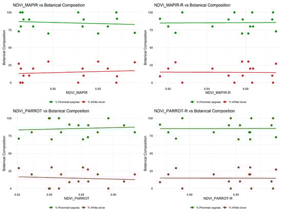 The main objective of this research is to analyze the performance of three spectral sensors (a modified RGNIR camera, a multispectral camera with separate bands, and a spectroradiometer) in estimating the proportions and development of white clover and perennial ryegrass. To this end, a study was conducted using three remote sensors to monitor the proportions of perennial ryegrass and white clover in a forage mixture. By evaluating botanical composition and yield across four harvests, we aimed to explore their relationship with key vegetation and soil indices, including NDVI, BSI, CI, SAVI, and AVI. This approach seeks to enhance the accuracy of yield estimation in grass–legume pastures using UAV-based remote sensing, contributing to more efficient and sustainable pasture management.