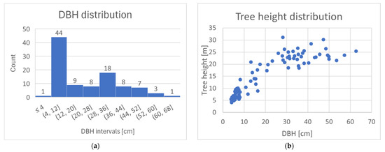 (a) The measured DBH values sorted into 8 cm intervals, depicting the distribution of the DBH throughout the whole sample plot, indicating a two-storey forest stand. (b) The distribution of tree heights in relation to the DBH.
