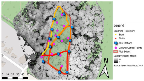 All scanning procedures followed a predefined trajectory through the plot (Figure 5), designed to maintain consistency across devices and facilitate the direct comparison of the resulting datasets. The trajectory was established by following distinct pathways within the forest, thereby ensuring consistency across all scanners. The common scanning path ensured that variations in data quality and completeness could be attributed primarily to the characteristics of the scanning systems themselves, rather than differences in spatial coverage or operator behaviour. Although this approach may not be ideal for certain scanner types, particularly those with limited LiDAR beam reach, this study focused on evaluating the potential of the 3D outputs that could be obtained within a comparable time frame. This was performed with consideration of the device cost, which does not necessarily scale proportionally with the scanning performance.
