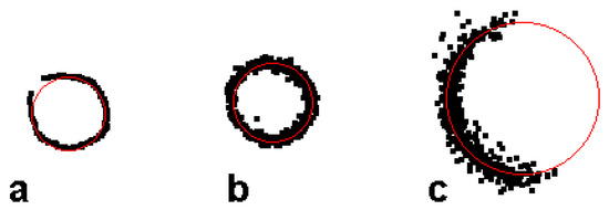 Examples illustrating the circle fitting (red colour) application of the RANSAC algorithm in various scenarios. (a)—A nearly complete scan from terrestrial static scanning (TLS). (b)—A complete scan from MLS scanning with higher variability. (c)—An incomplete scan captured by the mapry device.