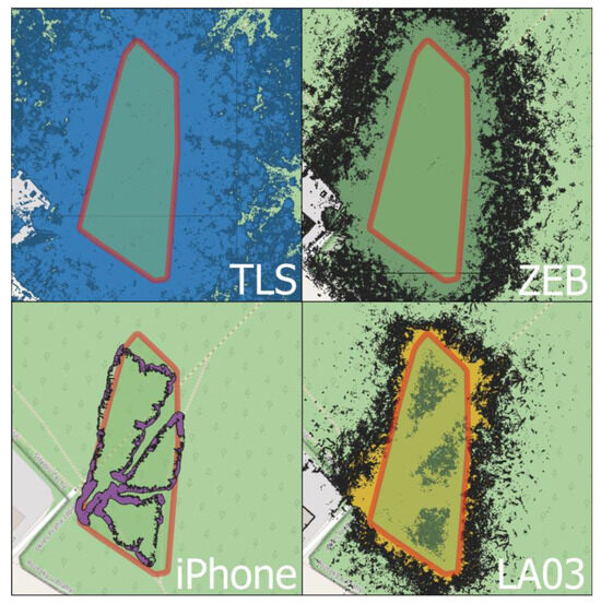 Visualisation of scanning methods’ spatial coverage across the sample plot area delineated by the red outline.