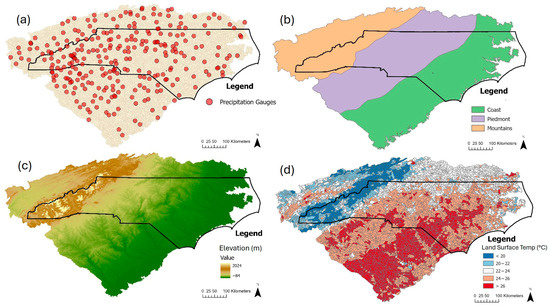 Study region, with North Carolina boundary and (a) 282 precipitation gauges, (b) physiographic regions, (c) ground elevations, and (d) mean daily MODIS land surface temperature (°C).