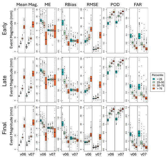 To compare the data at various precipitation event magnitudes, the gauge data were grouped into four magnitude percentiles of all matched events, <25th, 25th–50th, 50th–75th, and >75th. This was performed for the Early, Late, and Final datasets for both v06 and v07. The gauge data were used to ensure similar percentile groupings for each dataset. Each corresponding satellite event was then matched, separated into the corresponding gauge percentiles, and the errors were calculated.