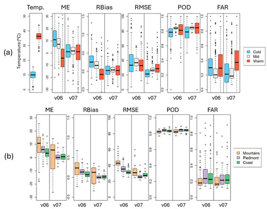 Errors separated by daily land surface temperature (LST) classes (Figure 1d) at each gauge location showed improvement in performance for v07 over v06 at all temperatures for error metrics quantifying margins of error, notably for the upper and lower temperature groups (Figure 3a). The average temperature classification threshold was >36 °C for the greater-than-95th percentile warm temperature quantification, and <9.6 °C for the less-than-5th percentile cold temperatures. For the 5th percentile threshold, 58 gauges had a threshold below 7.5 °C, 29 below 5 °C, 9 below 2.5 °C, and 3 below 0 °C. Concerning the 95th percentile threshold, 204 gauges had a threshold above 35 °C, 98 above 37.5 °C, and 28 had a threshold above 40 °C. Note that LST is not air temperature and can be warmer or colder than air temperature based on surface and atmospheric conditions [61,62]. Therefore, the percentile values presented are specific to LST and cannot be used with air temperature values. In v06, events occurring during colder temperatures were overestimated in terms of ME and RBias, while the warmer events tended to have underestimated magnitudes. In v07, the average errors were 0.3–1.8 for ME and 0.04–0.05 for RBias. For RMSE, events occurring during colder temperatures had the largest errors in v06 and the lowest errors in v07. A summary of all mean error metrics in v06 and v07 overall, as well as based upon percentile, region, and temperature separations, is included in Table A2.