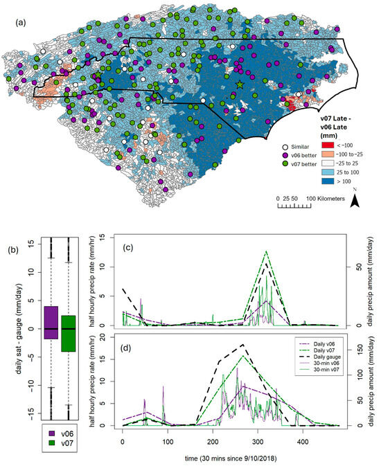 (a) Ten-Day GPM IMERG precipitation accumulation (mm) for Hurricane Florence, 10–19 September 2018, displaying v07–v06. The performance of the two datasets compared to each gauge (n = 249) is shown, with the time series of the starred gauges shown in (c,d). (b) Satellite—gauge daily precipitation values (mm/day) for each day of gauge observation during the 10-day time period. (c) The time series for the western starred gauge, with v07 errors better than those of v06 but resulting in slightly overestimated event precipitation. (d) The time series for the eastern starred gauge, where v07 is better than v06, with both underestimating event precipitation.