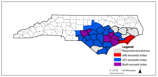 The northeastern counties requiring FEMA assistance but not flagged as exceeding the precipitation frequency analysis in v06 or v07 (Pitt, Beaufort, Hyde, and Pamlico Counties) experienced flooding due to coastal storm surge and downriver flooding [68]. Therefore, this could be one limitation of the utilization of precipitation as an indicator of flooding and damages due to extreme precipitation.