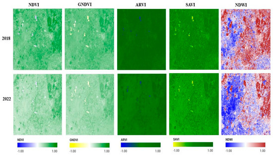 NDVI was used to differentiate the vegetation from non-vegetated areas by measuring the density and health of vegetation. GNDVI was employed to improve sensitivity to chlorophyll content and detect variations in crop health, whereas ARVI reduced atmospheric effects in vegetation and solved the effects of aerosol hindrance in the vegetation analysis. SAVI minimized the soil background influence in sparsely vegetated regions of the test site [51]. Additionally, in thick vegetation areas, it has been demonstrated that a negative soil adjustment factor in SAVI improves LAI estimation and lessens saturation effects [53]. NDWI was used to identify water bodies (Table 3). These indices were computed from the fused composite image of the respective cropping periods of 2018 and 2022 and integrated as additional classification features in Google Earth Engine (Figure 2 and Figure 4).