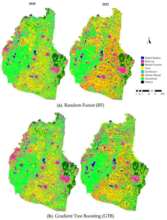 Based on the comparisons of other accuracy performance metrics for class-specific categorization, Producer’s Accuracy (PA), User’s Accuracy (UA), and F1 Score are assessed across the land cover classes (Table 6). RF and GTB consistently outperformed NB, particularly in land cover classes of corn, winter wheat, and mixed forests (Table 6). In 2022, RF maintained high accuracy for water bodies and mixed forests with a PA of 1, UA of 1, and F1 score of 1, respectively (Table 6), while NB significantly misclassified mixed forests, yielding a PA of 0.67, UA of 0.33, and F1 score of 0.44, respectively (Table 6). GTB performed slightly better than RF for built-up areas with an F1 score value of 0.92 compared to 0.82 for RF (Table 6), indicating strength in classifying urban areas. Sunflower was totally misclassified, yielding a PA, UA, and F1 value of 0, respectively, across all classifiers in 2022, highlighting a challenge in distinguishing this crop compared to other vegetation categories (Table 6).