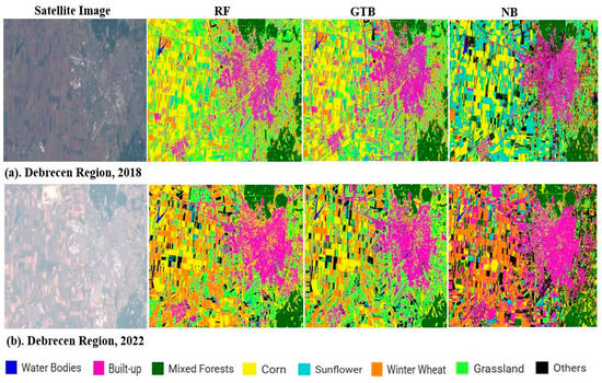Narrowing down our analysis by masking out the Debrecen area from the broader TIKEVIR region, it can be noted that RF and GTB were consistent with the satellite images for 2018 and 2022, respectively (Figure 6). This further demonstrates the effectiveness of RF and GTB in producing land cover maps for supporting satellite yield estimates as well as budgeting water resources for irrigated fields.