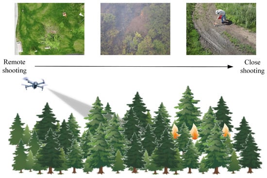As shown in Figure 1, in the process of forest fire detection, UAVs face two different application scenarios: remote shooting and close shooting. This brings about the difficulty of multi-scale target detection and matching for forest fires. At the same time, the aerial image is affected by the change in flight attitude and vegetation occlusion. The target presents significant multi-scale features, deformation characteristics and edge blurring effect. The traditional fixed shape detection model has the defects of feature matching deviation and scale sensitivity. Therefore, RGB-Thermal fusion detection can give full play to the advantages of visible light image (RGB) and thermal infrared image (T), and make up for the deficiency of single mode [2]. The visible light image contains rich texture and color information, which can accurately identify the color characteristics of the flame and provide the basis for the detailed analysis of the fire target. The thermal infrared image is not limited by light conditions and vegetation occlusion, and can keenly capture high-temperature heat sources. Even in the presence of heavy smoke or in nighttime conditions, it can accurately pinpoint the locations of fire points. In the remote shooting scene, the initial fire point is small, and the combination of the high temperature signal in the thermal infrared image and the smoke texture feature of the visible light image can also detect the potential fire source in time. In the close shooting scene, RGB-Thermal fusion detection can quickly adapt to the scale change and shape distortion of the target in the face of complex vegetation environment and fire scene with dramatic perspective change.