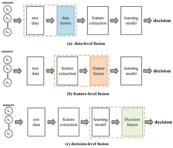 At the methodological level, the multimodal fusion strategies can be mainly categorized into three types: data-level fusion, feature-level fusion and decision-level fusion. They correspond to different stages of the algorithmic model inference process, as shown in Figure 2.