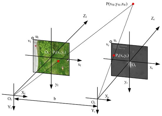 The visible and thermal infrared images are usually captured by different sensors, and the modality gaps caused by different imaging systems or styles pose a great challenge to the matching task [19]. Although complementary information is provided in different imaging modalities, multimodal images obtained directly from the camera are not aligned for direct fusion, as shown in Figure 4. This figure depicts a stereo vision system framework. Two cameras, each associated with independent coordinate systems (left and right), are included.